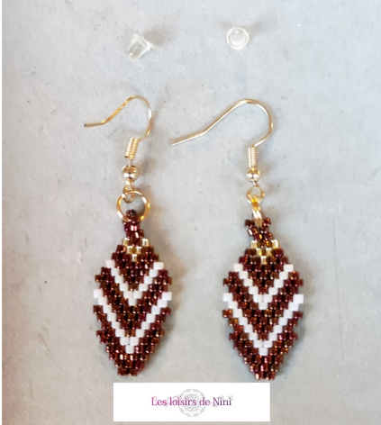 Une paire de boucles d’oreilles en forme de feuille en perles de rocaille de verre Toho tissées en brick stitch avec du fil Nymo couleur sable et montées sur anneaux brisés double doré et perceuses dorées.