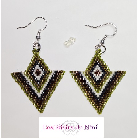 Une paire de boucles d’oreilles avec motif géométrique en perles de rocaille de verre Miyuki et Toho tissées en brick stitch avec du fil Nymo couleur sable et montées sur anneaux brisés double argenté et perceuses argentées.