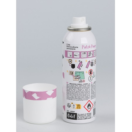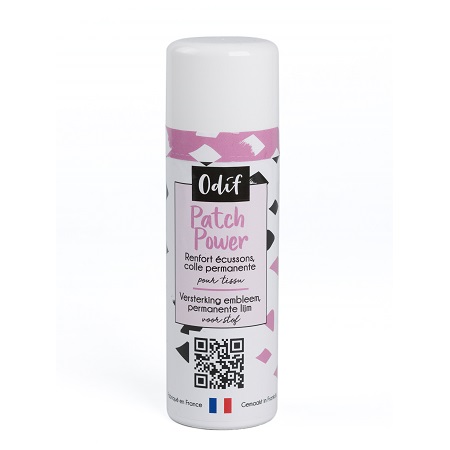 Patch power d’Odif est une colle permanente en spray pour tissu pour coller les écussons et renforcer les patchs thermocollants.